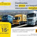 Du 1er septembre au 31 octobre 2025, pour l’achat de 2 pneus poids lourds Continental, profitez de 20€ HT remboursés par pneus pour la dimension 22,5″ et 15€ HT remboursés par pneus pour les dimensions 17,5″/19,5″/20″ sur les gammes transport de marchandises, transport de voyageurs, construction et petits poids lourds.